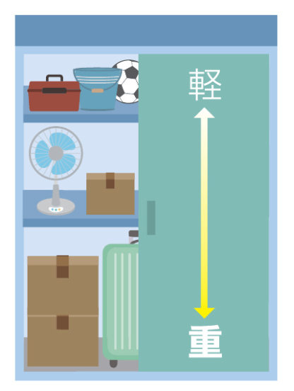 物置内での安全な動線確保やケガ防止のためにも軽い荷物は上・重い荷物は下に収納するようにしましょう。