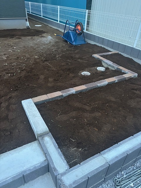 お庭の土留めになっている既存ブロックの天端から、お庭の土部分が5㎝下がっています。