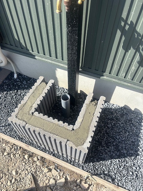 その為、桝や水道の嵩上げ・使い勝手を考慮し立水栓の受けの高さを、ブロックで調整しました。