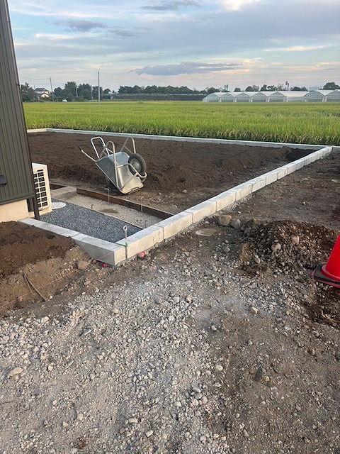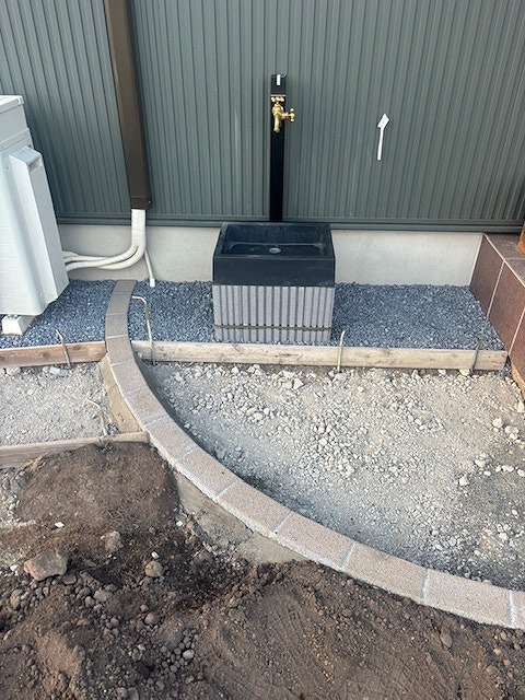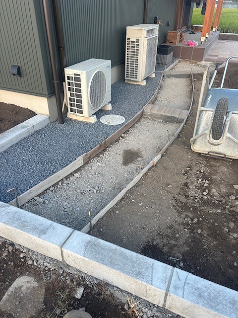 土間コンクリートの型枠・アクセントのインターロッキングが完了。