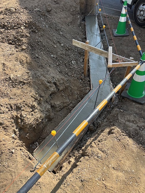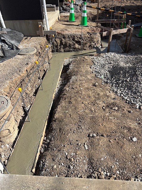 本日は、新設土留めブロック・門塀ブロック積のベース基礎を施工しています。