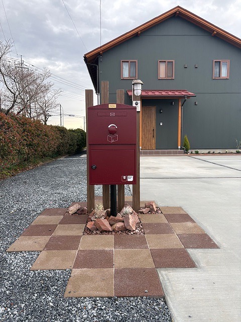 門柱としてスリットフェンス4本配置し、お洒落な宅配ポスト(施主様支給品)を設置しました。