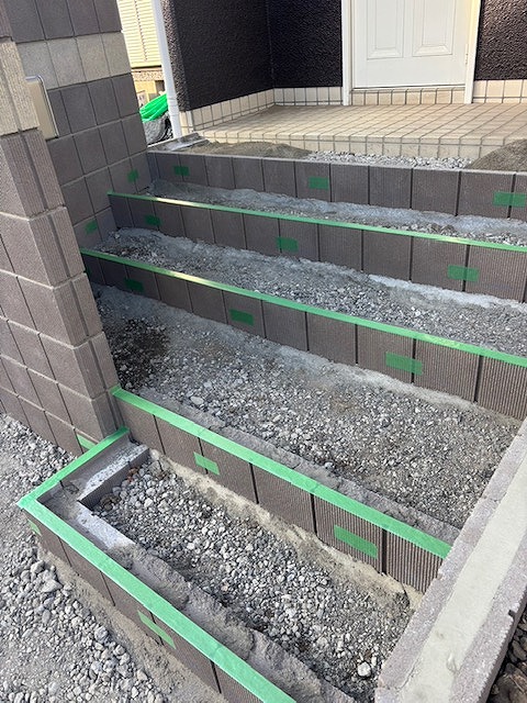 階段の蹴上ブロックは階段床面土間コンクリートを施工時に汚れ予防にテープで養生しています。
