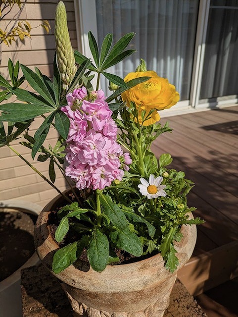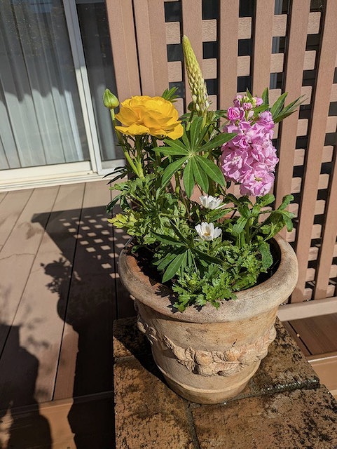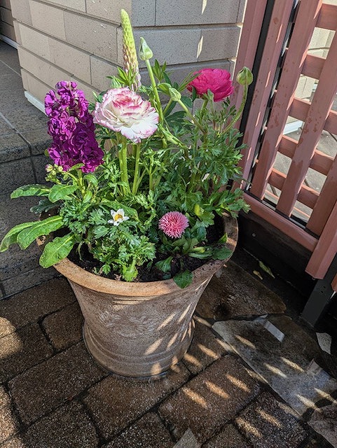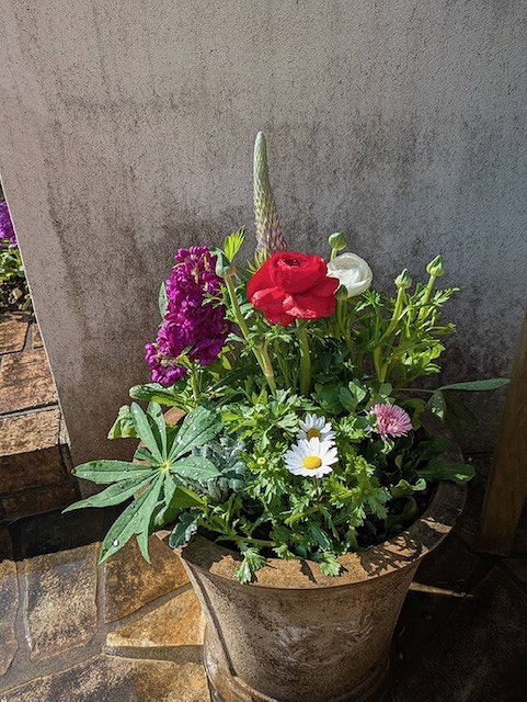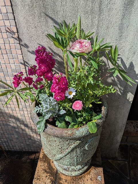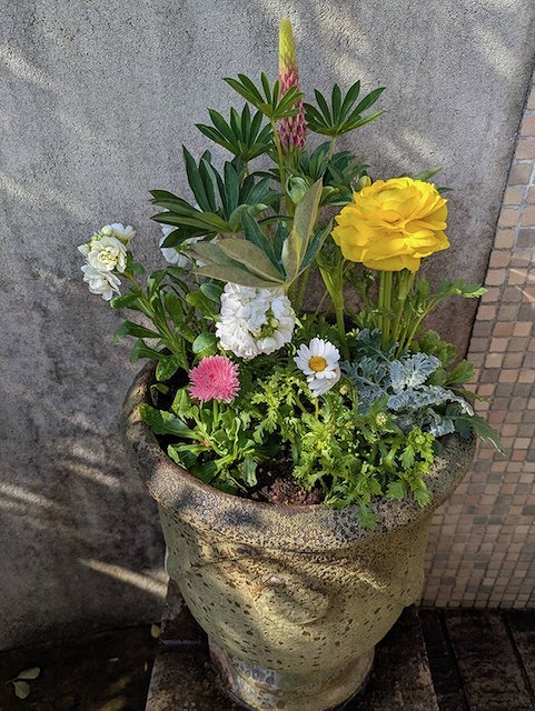 ルピナス・ラナンキュラス・ストック・ノースポール・デ-ジ-など、カラフルな寄せ植えです(^^♪
