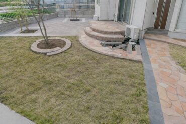 テラスからアプローチまでの小道にレンガの縁石とコンクリート製枕木を配置。