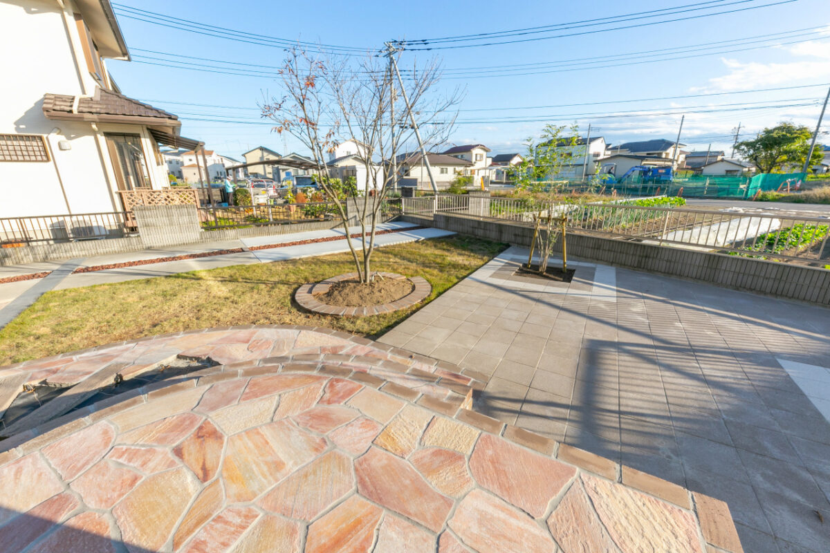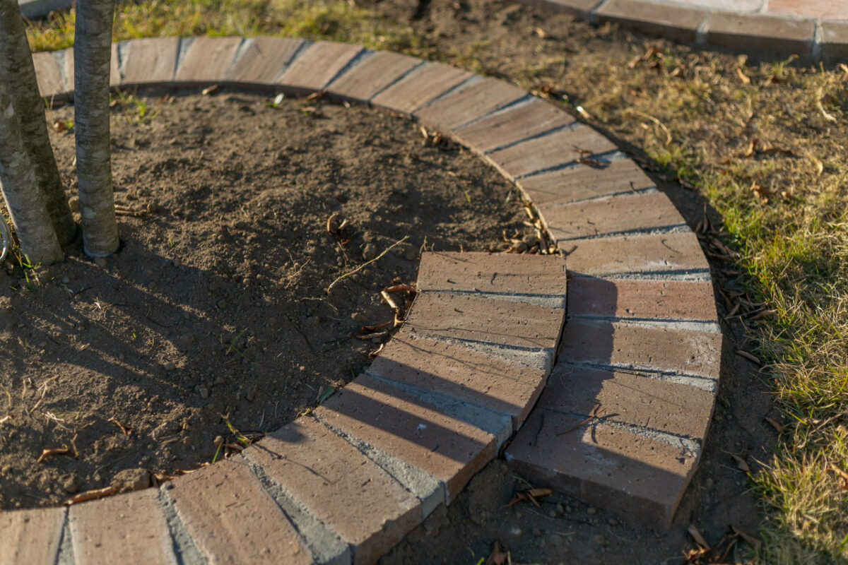 樹木周りをレンガ笠木で円形に囲いアクセントに!